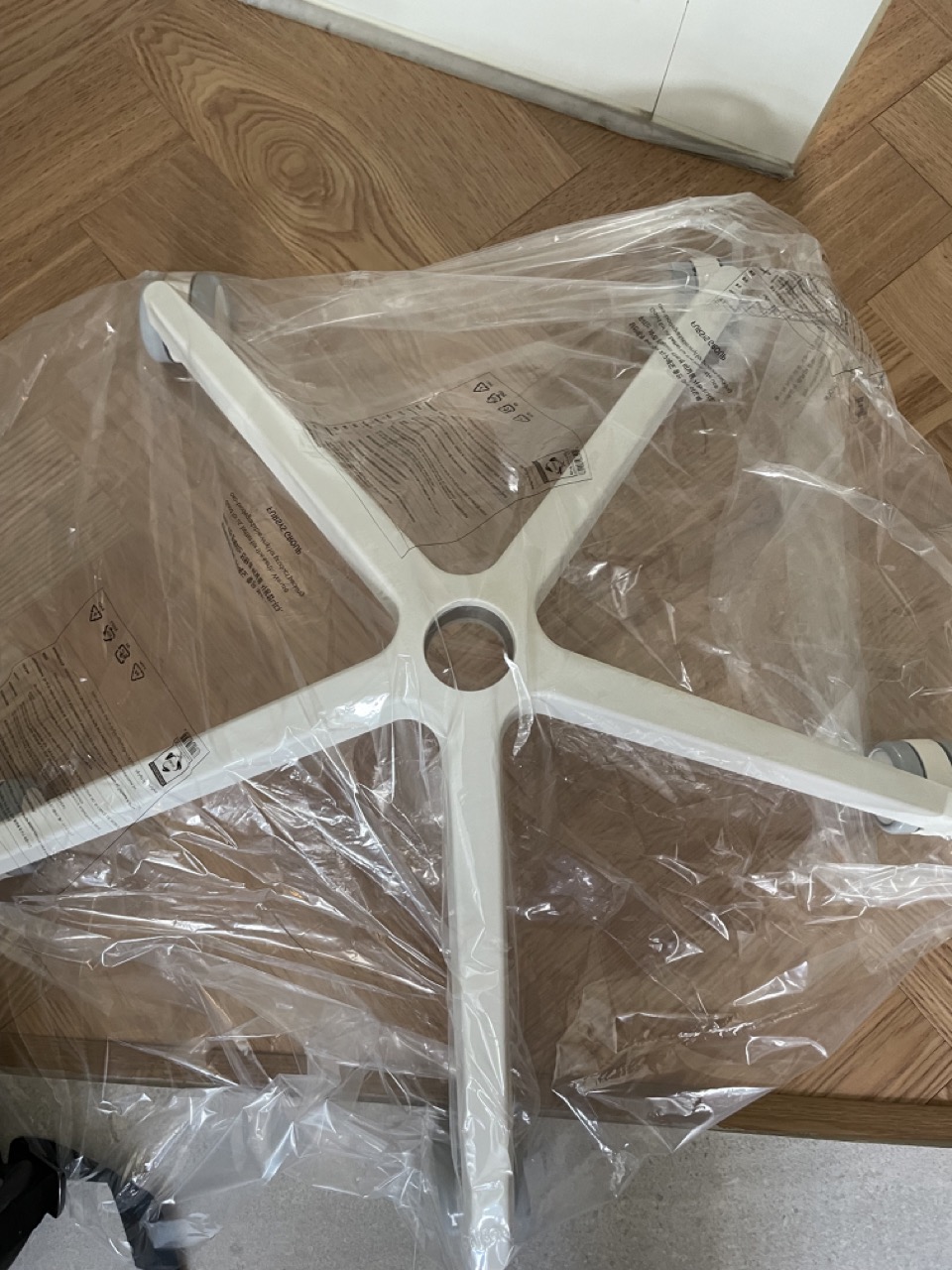 의자 바퀴 파트를 바닥에 잘 놓습니다.