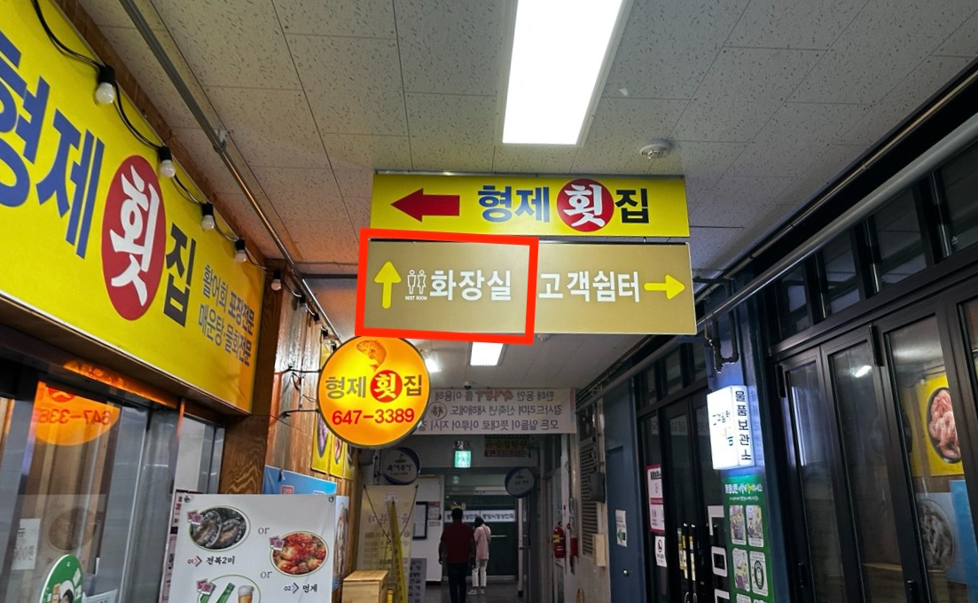 그럼 바로 화장실이 2층과 지하1층에 있다는 표지판을 바로 확인하실 수 있습니다. (연신 건어물 간판이 보이네요)