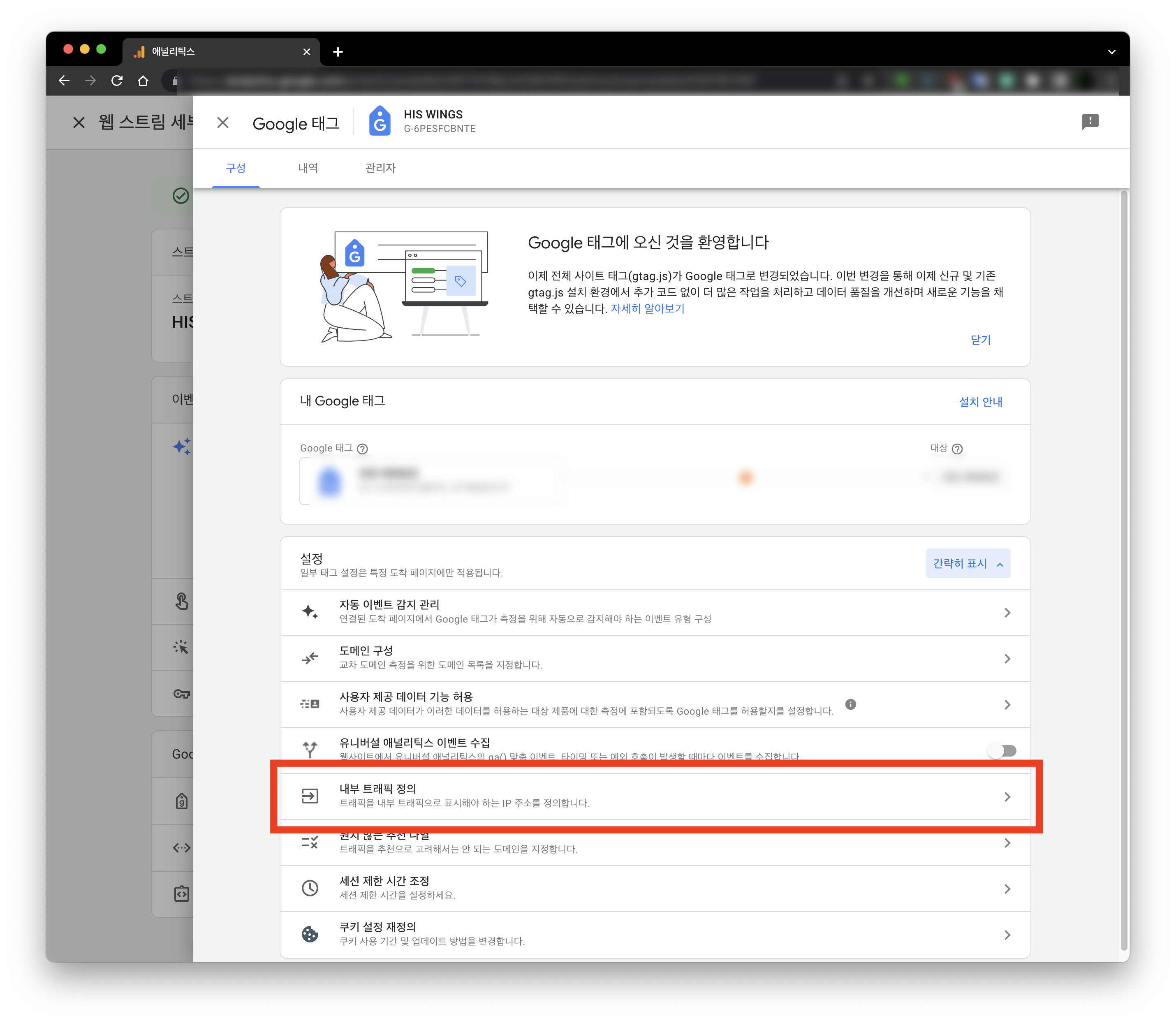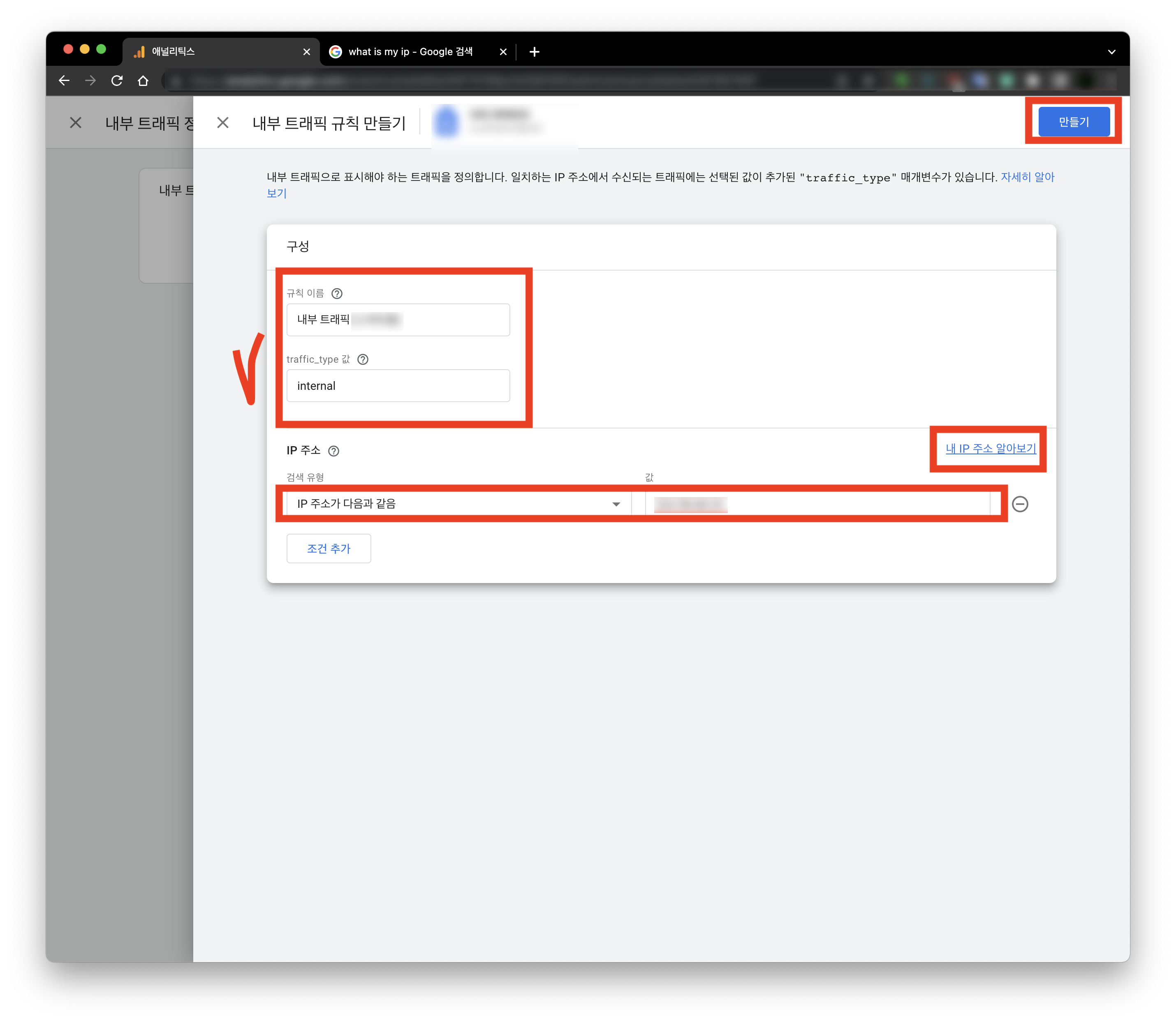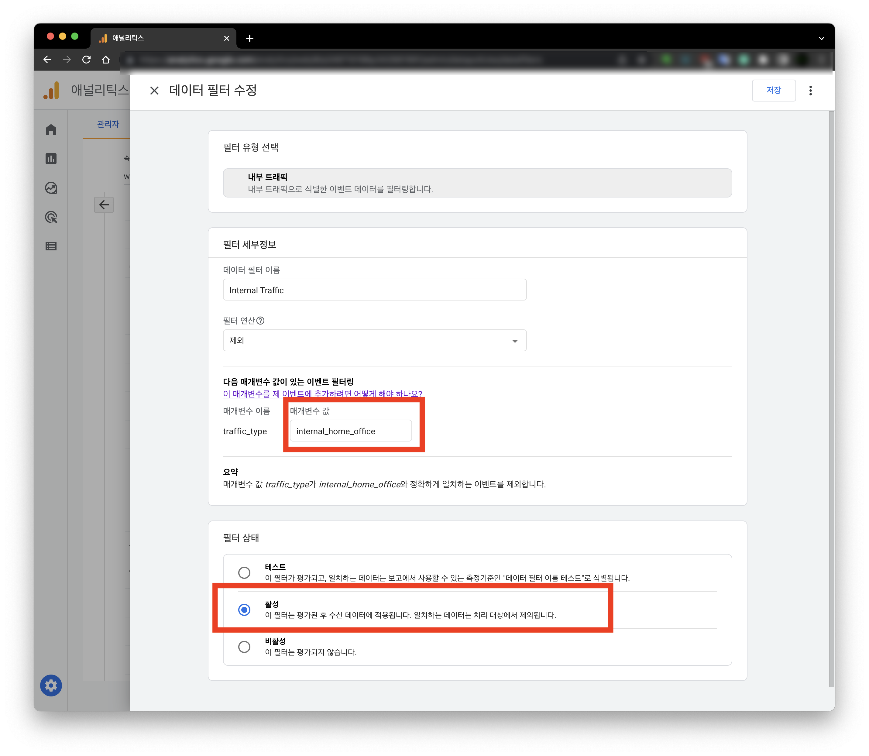 여기서 더블체크할 부분은 '매개변수 값'이 내부 트래픽 정의에서 기록한 값과 같은지 확인해보세요.
