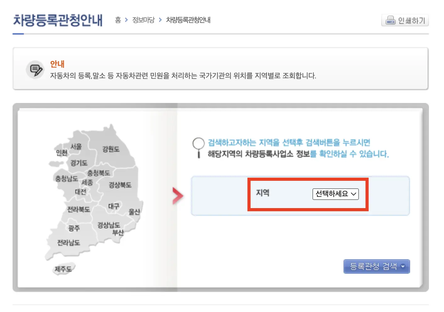 위의 페이지에 접속한후, 지역을 선택하시면, 해당 지역의 차량등록사업소 연락처를 확인하실 수 있습니다.