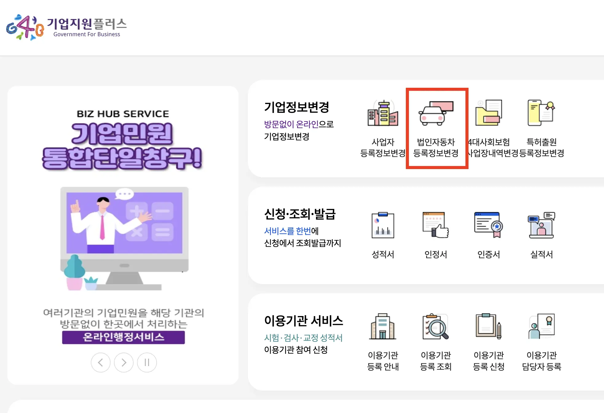 홈페이지 중앙에 위치한 "법인 자동차 등록정보 변경"을 클릭합니다.