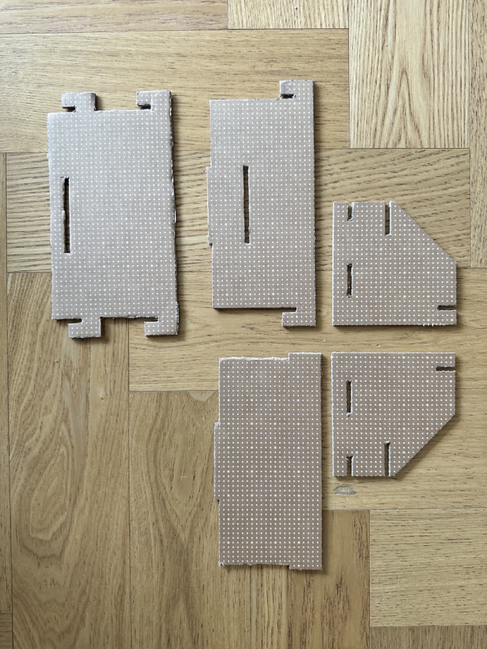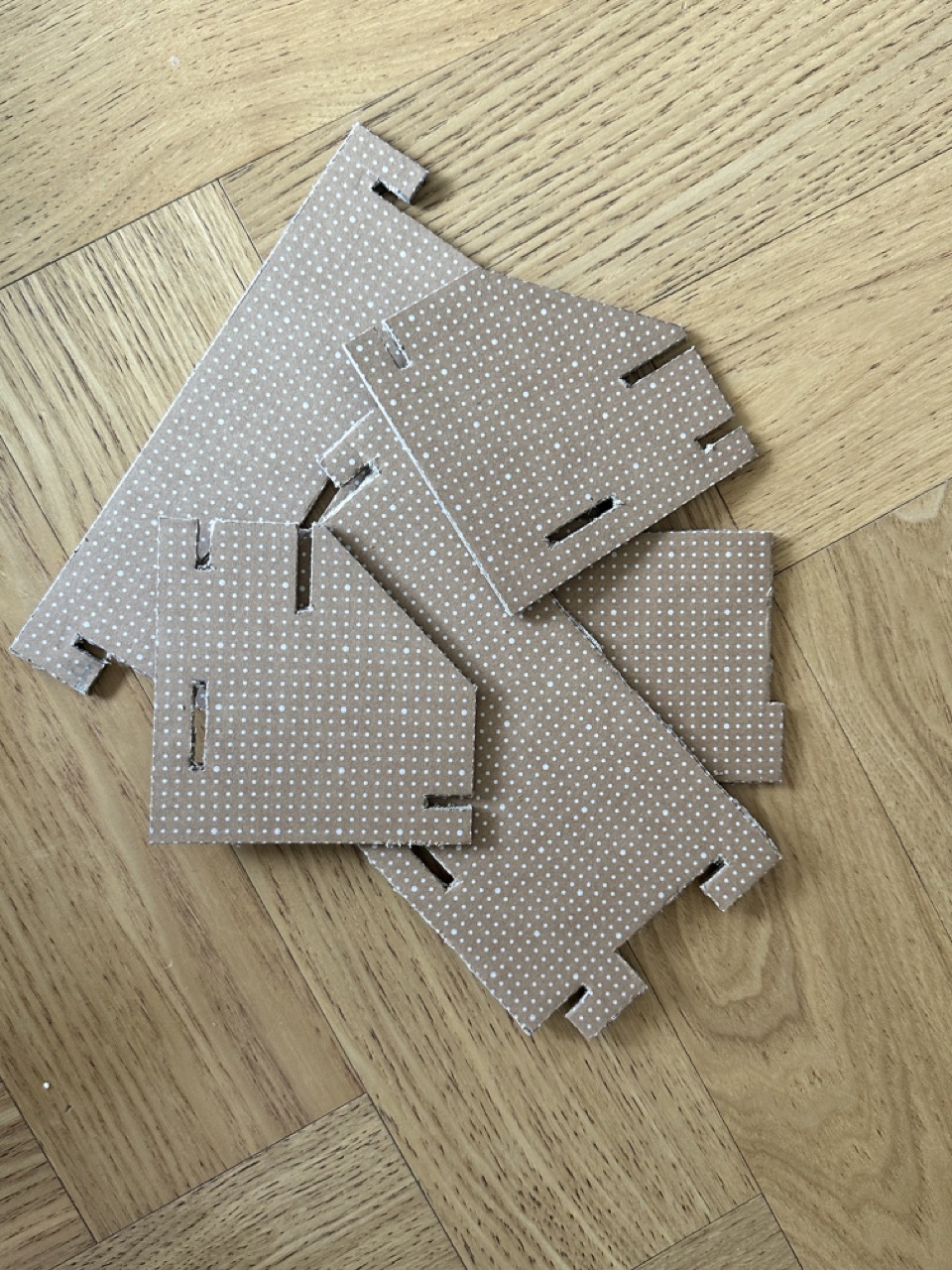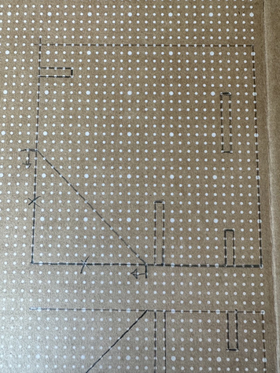 종이 박스의 인쇄가 되지 않은 공간에서 흰색 점을 연결하여 설계도를 그립니다.
