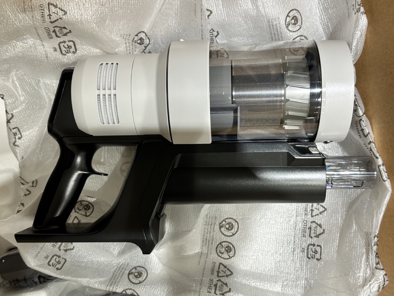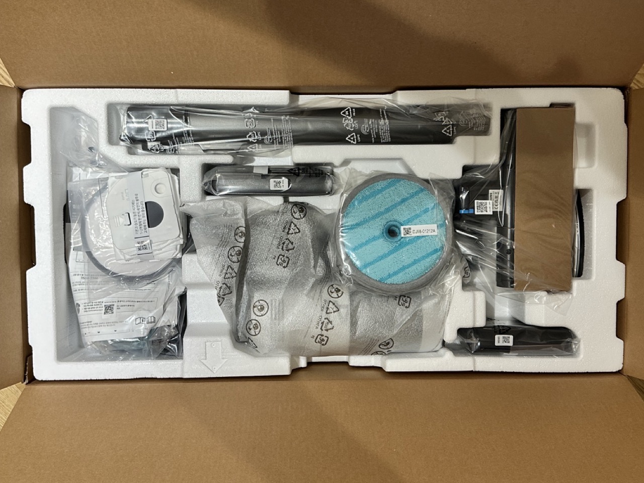 위층에는 본체, 청소포 3종, 먼지봉투 추가 2개, 노즐, 물걸레 도구 등이 들어 있네요.