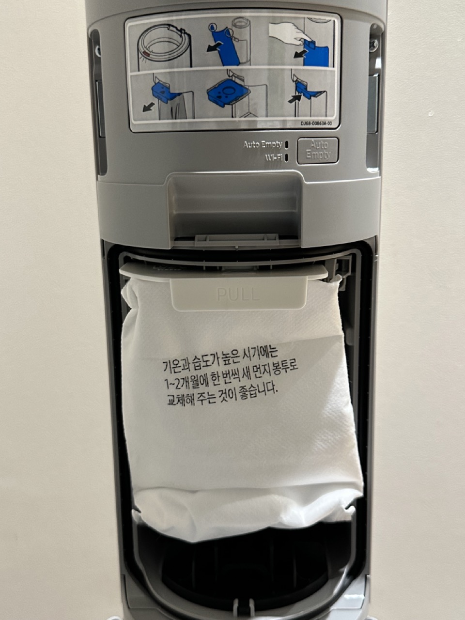청정 스테이션에 청소기를 장착하면, 먼지봉투로 빨아들이는데요. 일단 손에 먼지가 안 묻을 뿐만 아니라, 먼지 냄새도 안 맡아도 되니 건강상 좋습니다. 그런데, 먼지봉투크기가 더 크면 어떨까 하는 아쉬움이 있습니다.