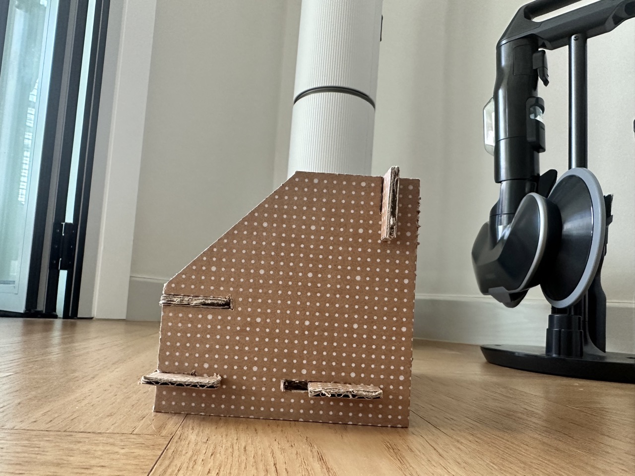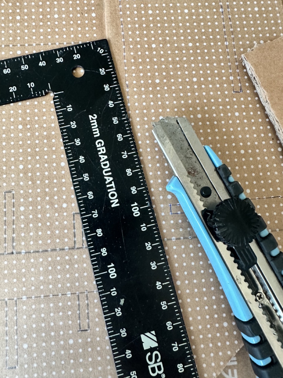 종이 박스의 인쇄가 되지 않은 공간에서 흰색 점을 연결하여 설계도를 그립니다.