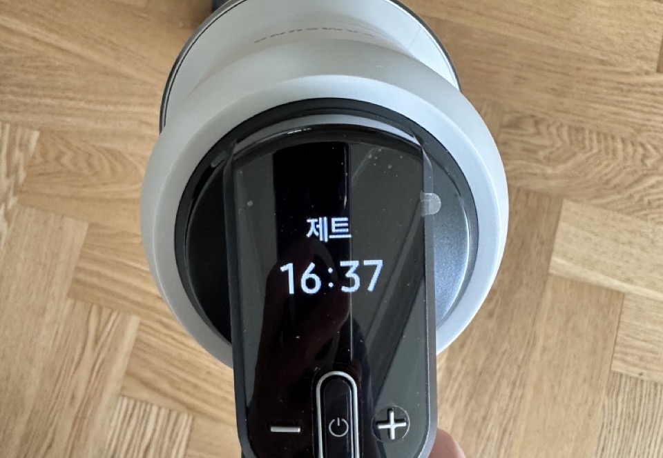 대용량 배터리 장착하고, AI모드로 시작했더니 1시간 1분이 나오네요! 물론, 사용하면서 강력하게 흡입해야 할 곳이 있어서, 시간은 줄어듭니다. (바닥 상황에 따라 자동으로 흡입력 조정) 가장 강력한 제트로 해도 16분 이상은 나오네요.
