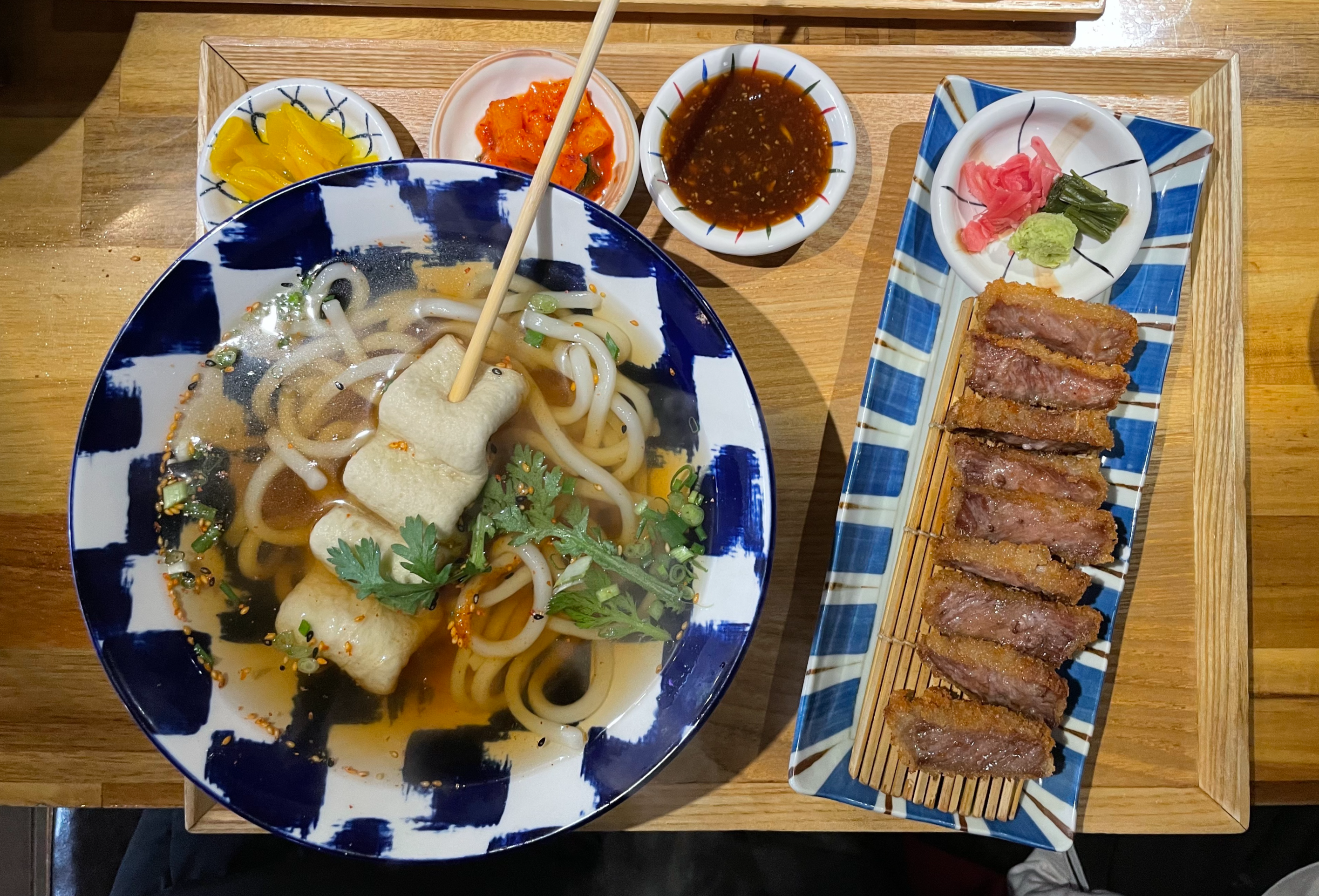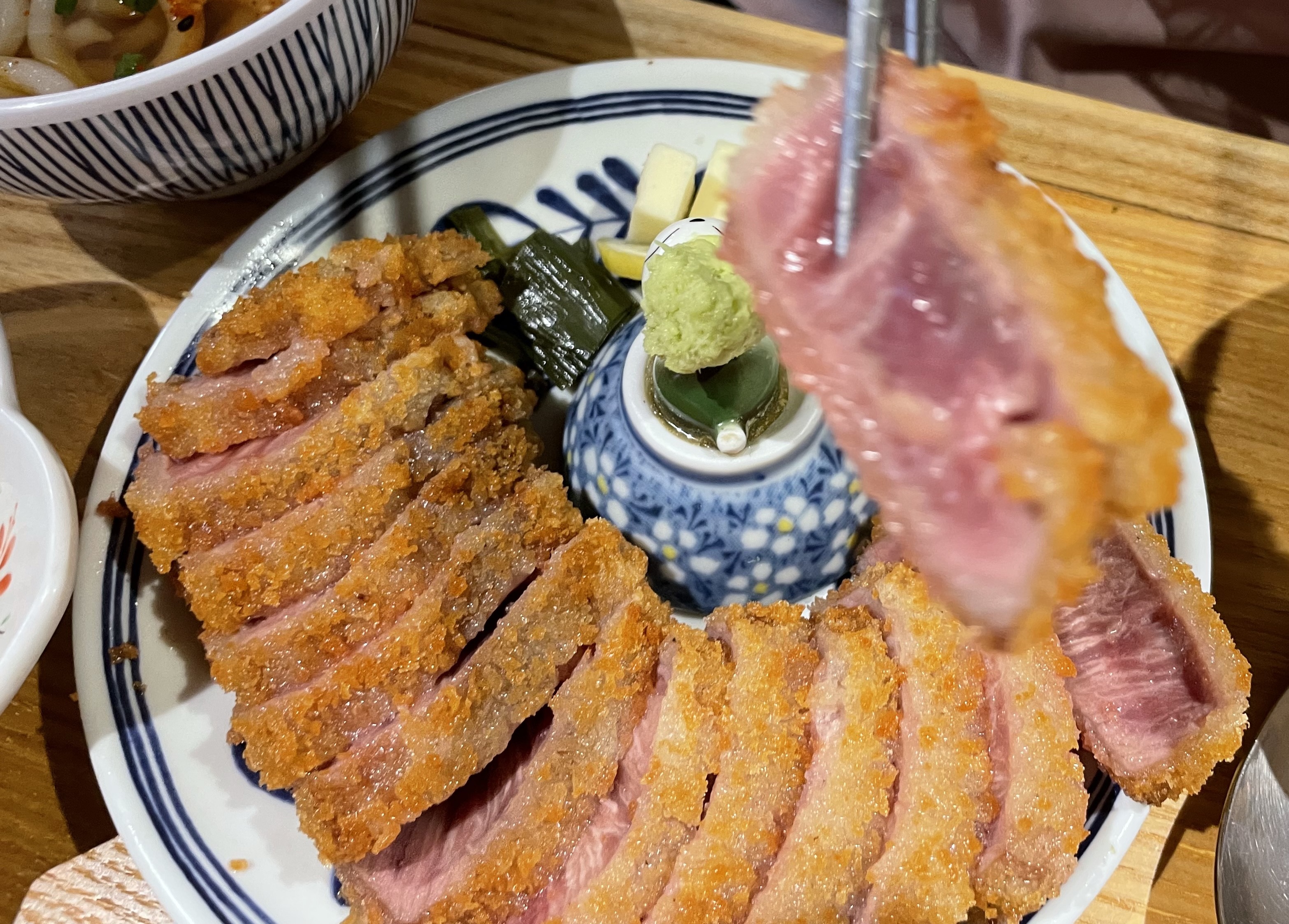 우동 세트에도 규카츠가 나오는데, 익혀서 나옵니다.