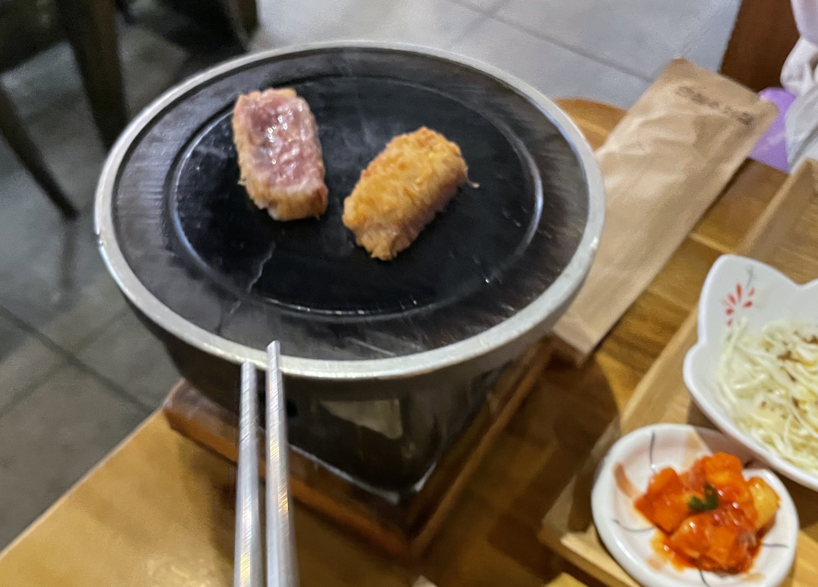 완전히 익지 않은 규카츠가 나오구요, 제대로 겉바속촉입니다. 즉석해서 익혀먹으니, 따듯해서 좋고, 신선해서 좋습니다.