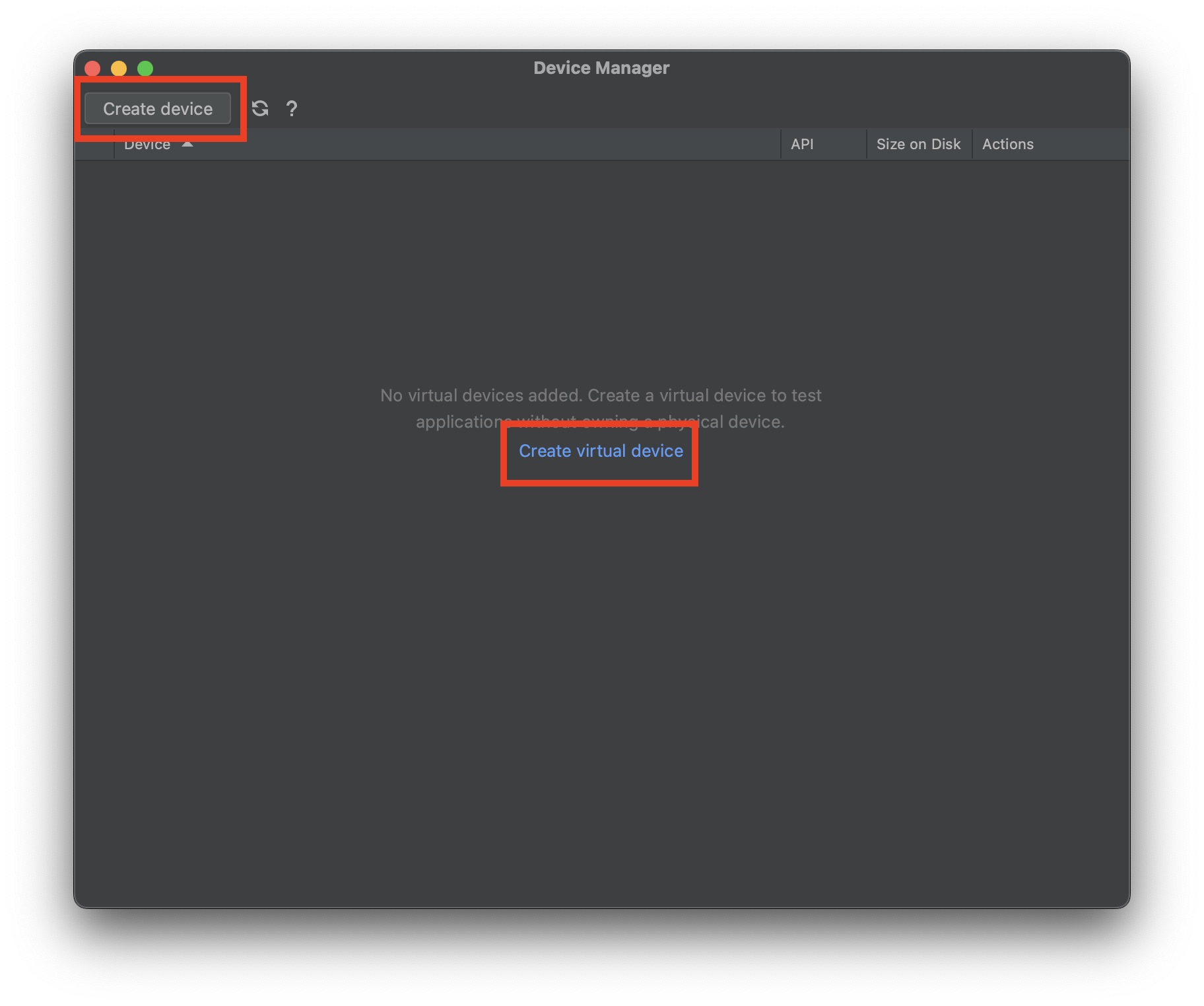 Create Device 메뉴를 선택합니다. (아마도.. 저는 OS가 영어로 되어 있어서 영어로 뜨는 것일 수도 있습니다. 한국어로 뜬다면, 가상디바이스 생성하기 등과 같은 단어가 나올 겁니다.)