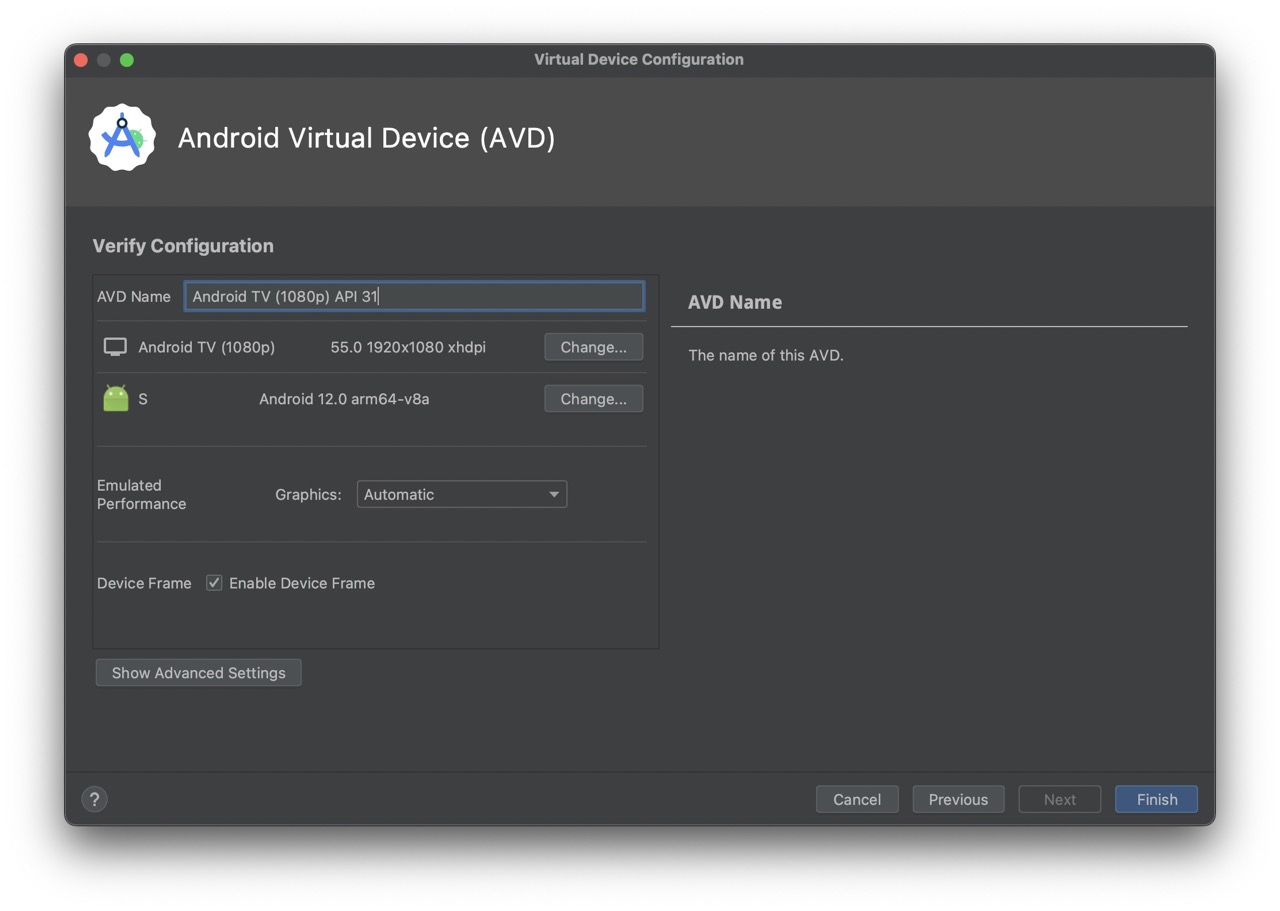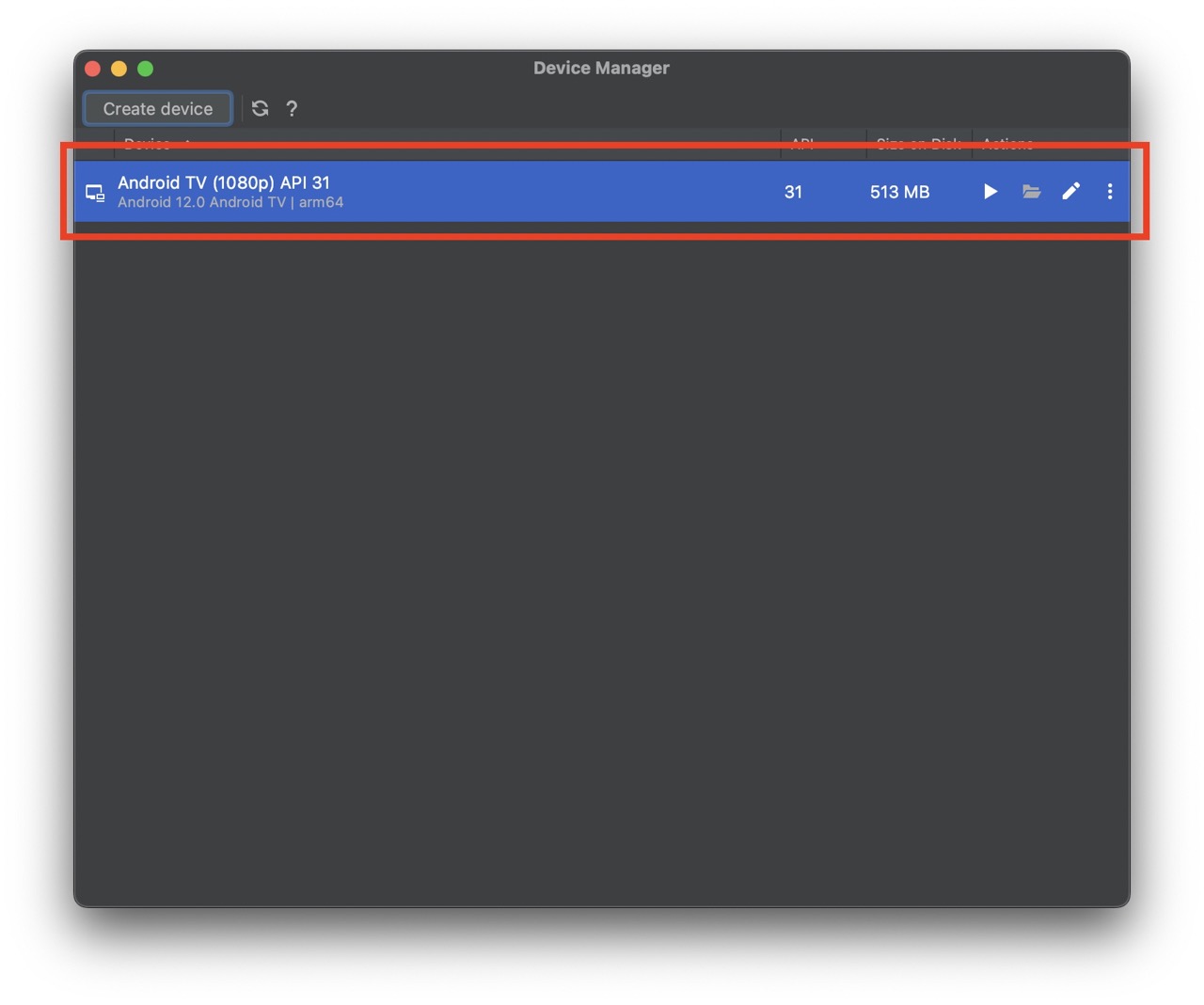 안드로이드 TV 가상 디바이스가 생성된 것을 볼 수 있습니다.