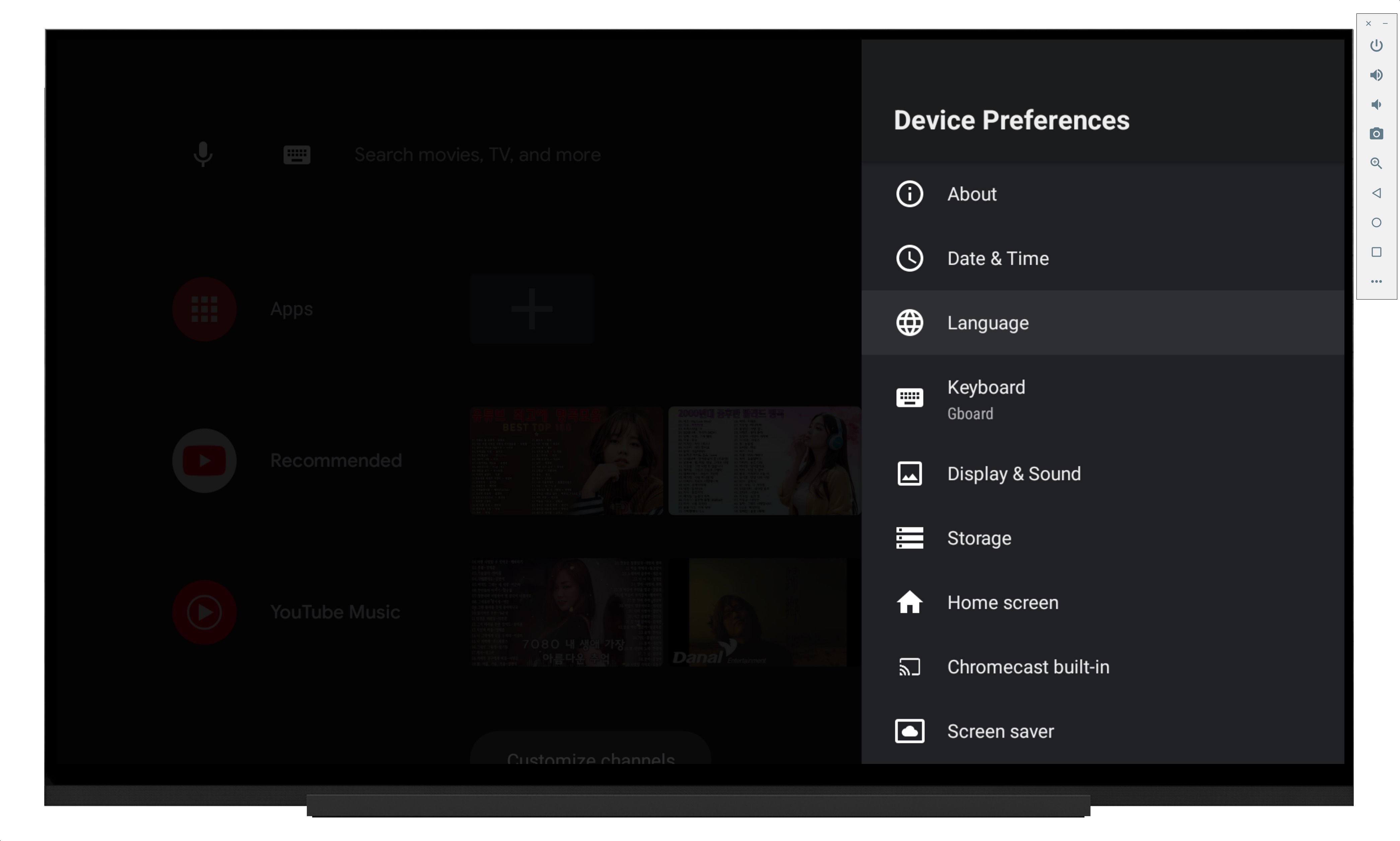 안드로이드 개발 프로그램 설치 -> 가상 디바이스 실행 -> 안드로이드 TV와 동일하게 사용