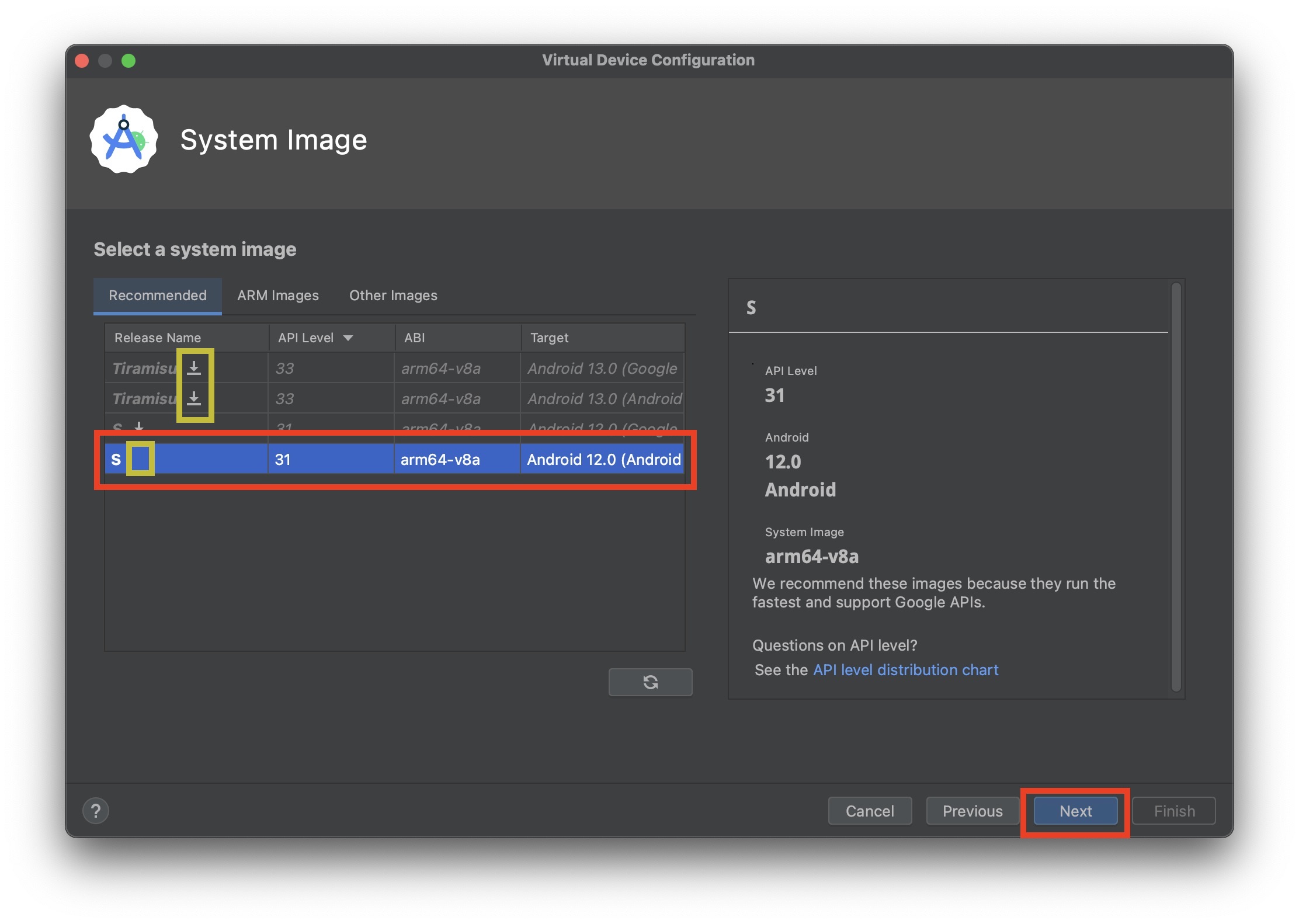 해당 디바이스에 설치할 버전을 선택하는 것인데, 저는 31을 선택했습니다. 선택 후, 이름 옆에 다운로드 버튼을 눌러서 일단 해당 버전을 다운로드합니다. (저는 이미 다운로드하여서 화살표가 안 뜨는 것인데, 위쪽 버전 이름 옆 다운로드 화살표 참고하세요)