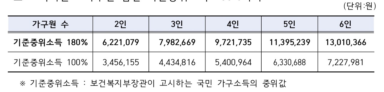 | 가구 소득이 기준중위소득 180% 이하인 가구 | 소득 기준 | ||