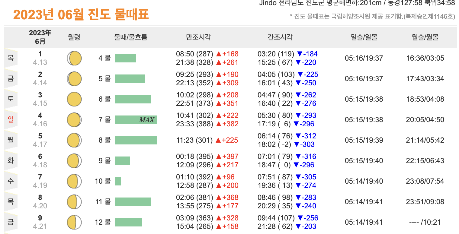 진도 휴가 계획이 있다면 물때표도 한번 확인해 보고 가면 흥미로운 여행이 될 것 같습니다.