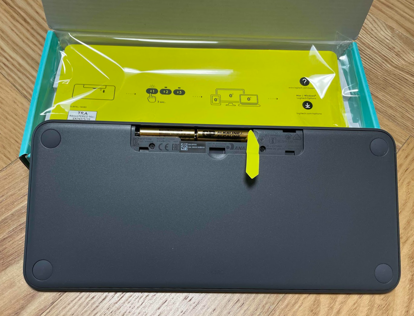 배터리는 내장되어 있어서, 배터리 태깅만 때면 바로 사용 가능합니다. 뒷면은 제품명 K380이 딱 인쇄되어 있네요.