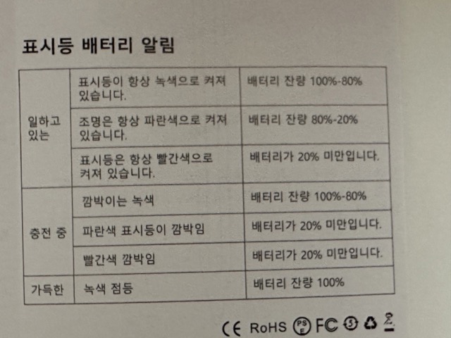 뒤쪽에 링 형태로 LED 표시기가 있는데, 색상에 따라 배터리 잔량을 3단계로 보여줍니다.