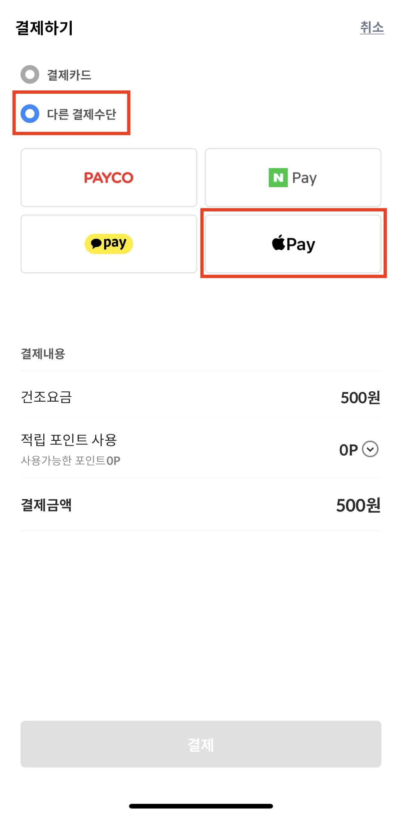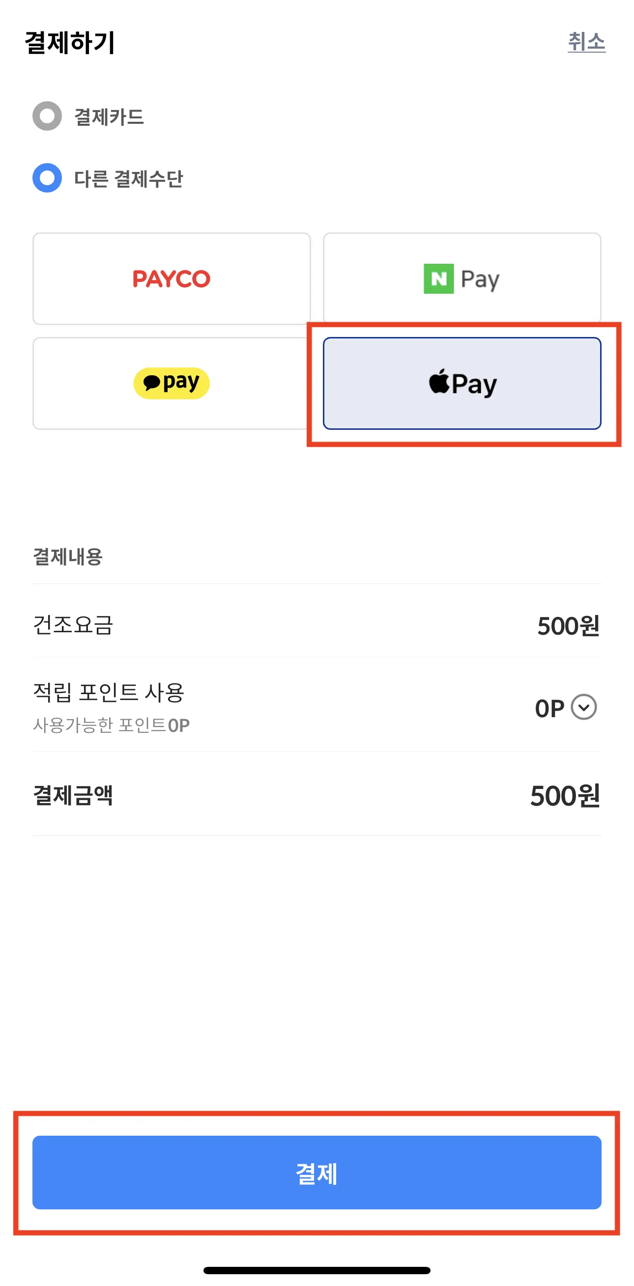 마지막 단계에서 결제 수단 선택화면에서 아래와 같이 Apple Pay를 선택하시면 됩니다.
