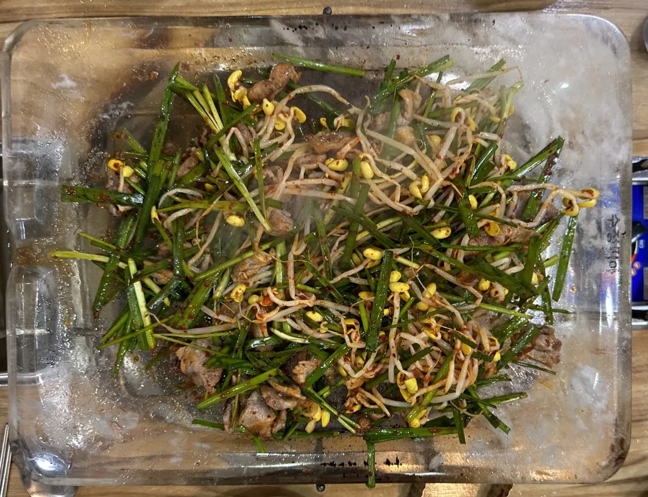 - 다 익으면, 부추/콩나물 무침을 그 위에 얹습니다.