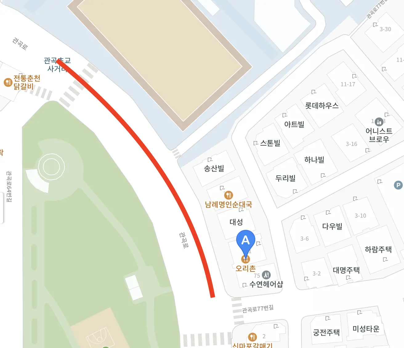 아래 지도를 보시면, 빨간색으로 표시한 부분, 오리촌이 시작되는 구간부터 스쿨존-주차 단속 지점입니다. 아무리 공휴일이라 하더라도, 이 구역은 피해서 주정차하는 것이 좋습니다.