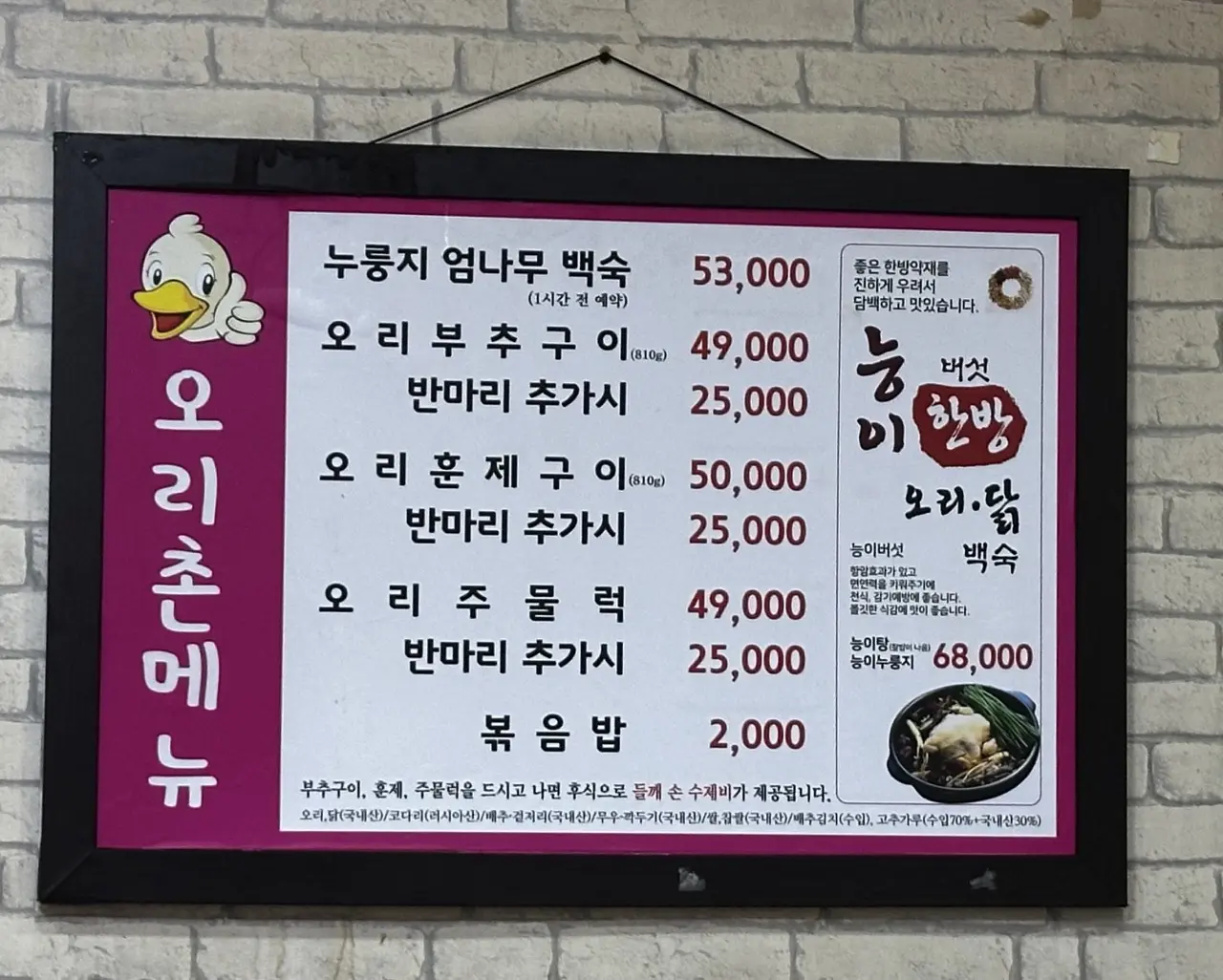 오리백숙은 1시간전 미리 예약을 해야 합니다.