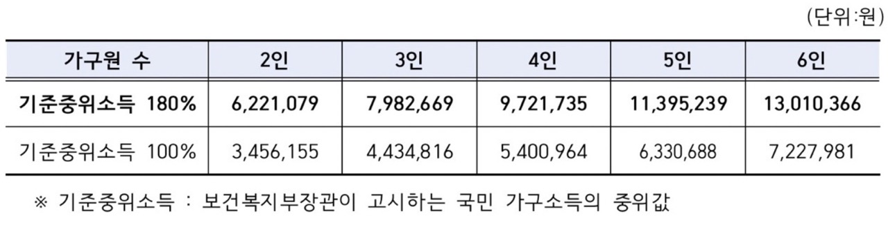 * 가구 소득이 중위 180% 이하여야 합니다.