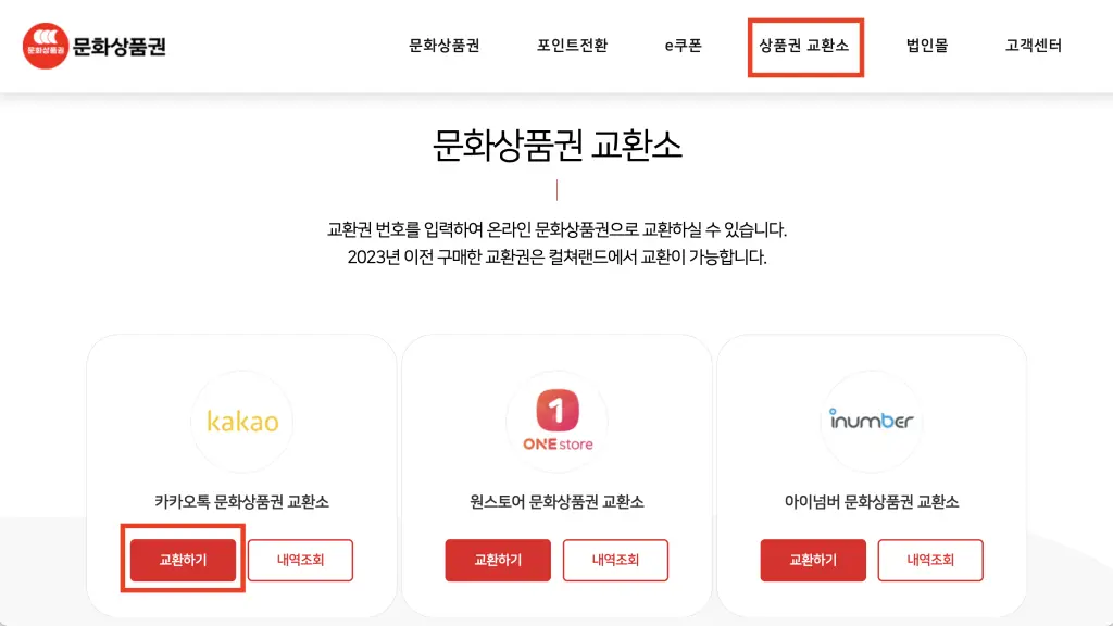 그래서, 먼저는 문화상품권 홈페이지의 [상품권 교환소] -> [카카오톡 문화상품권 교환소] -> [교환하기]를 선택합니다.