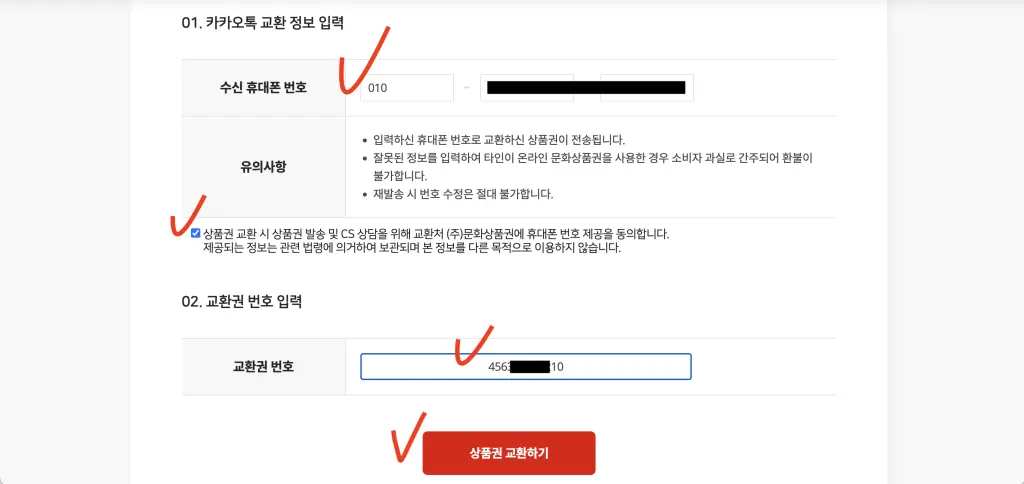 위와 같이 정보를 모두 입력하고, 상품권 교환하기를 클릭하면, 수신 휴대폰 번호로 "18자리 상품권 번호"가 전송이 됩니다.