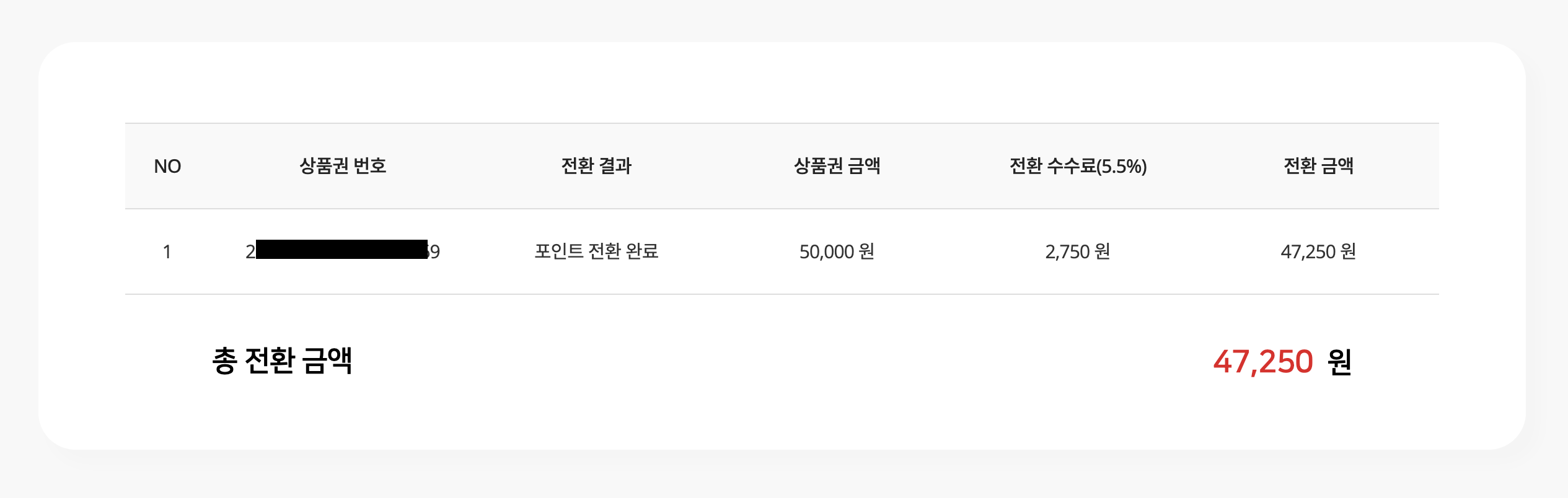 5만원의 경우. 47,250원으로 전환되고, 1만원의 경우, 9,450원으로 전환됩니다.