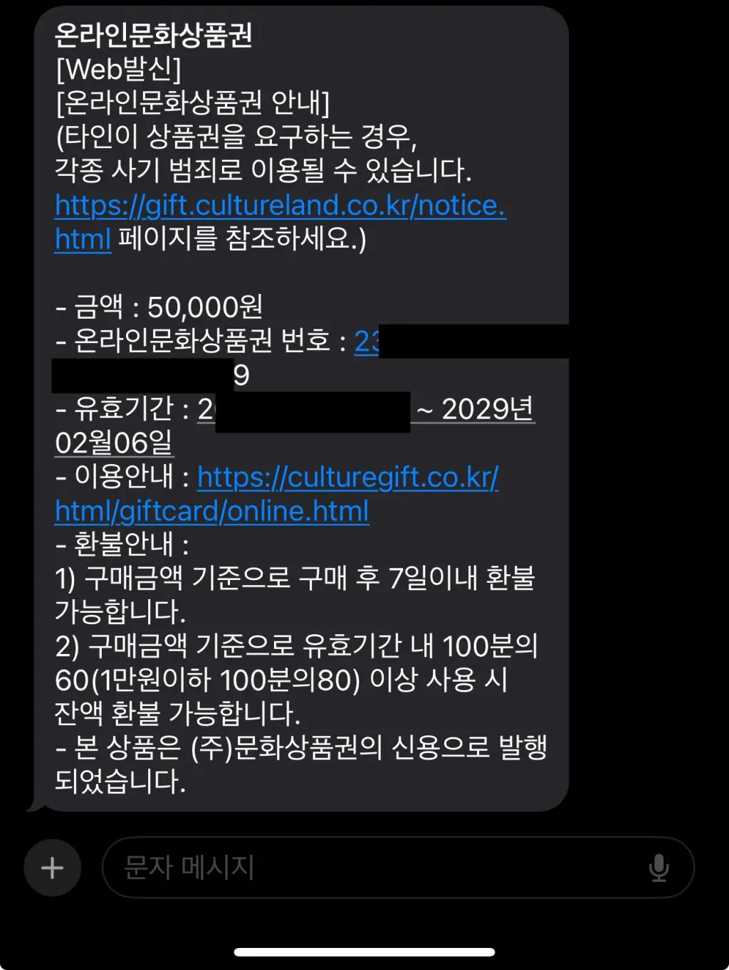 위와 같이 정보를 모두 입력하고, 상품권 교환하기를 클릭하면, 수신 휴대폰 번호로 "18자리 상품권 번호"가 전송이 됩니다.