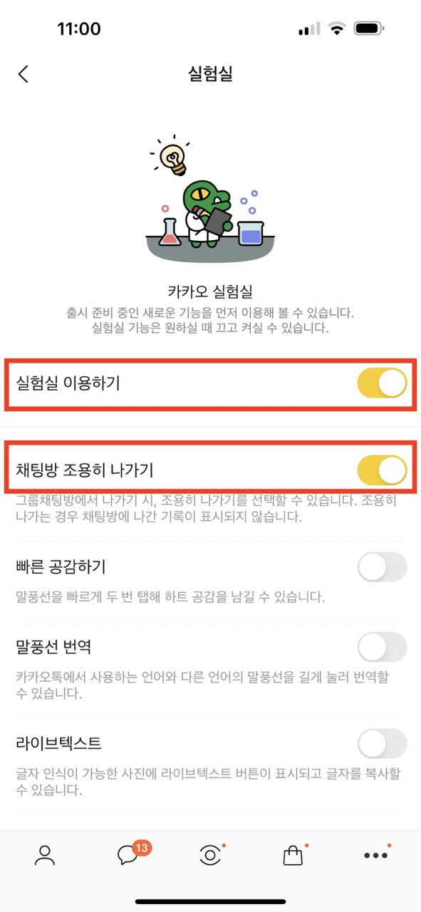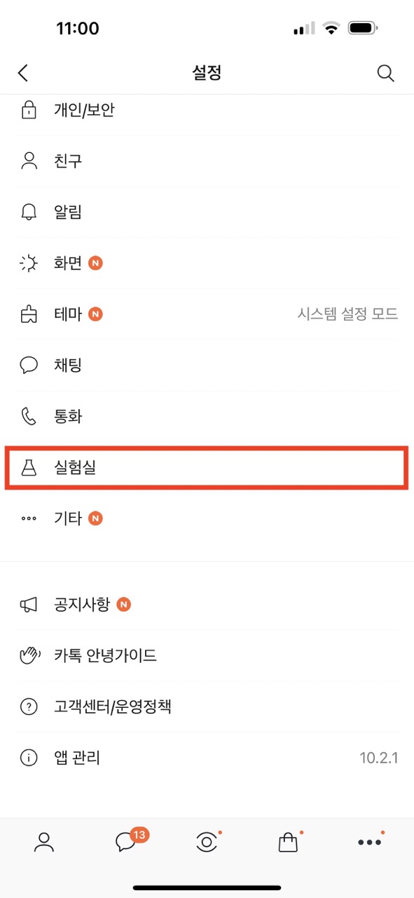 카카오톡 설정에 들어가시면, 실험실이라는 메뉴가 보입니다.