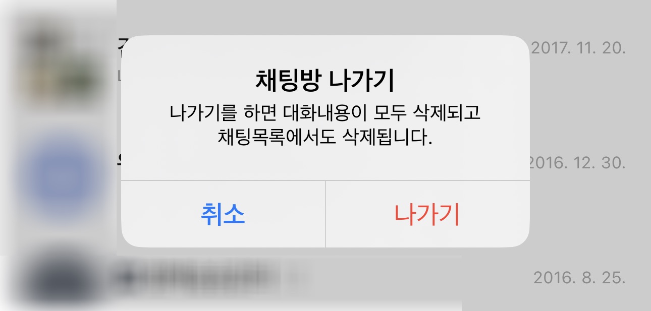 단톡방에서 나갈 때, 리스트화면에서 나가면 안 된다는 것입니다.