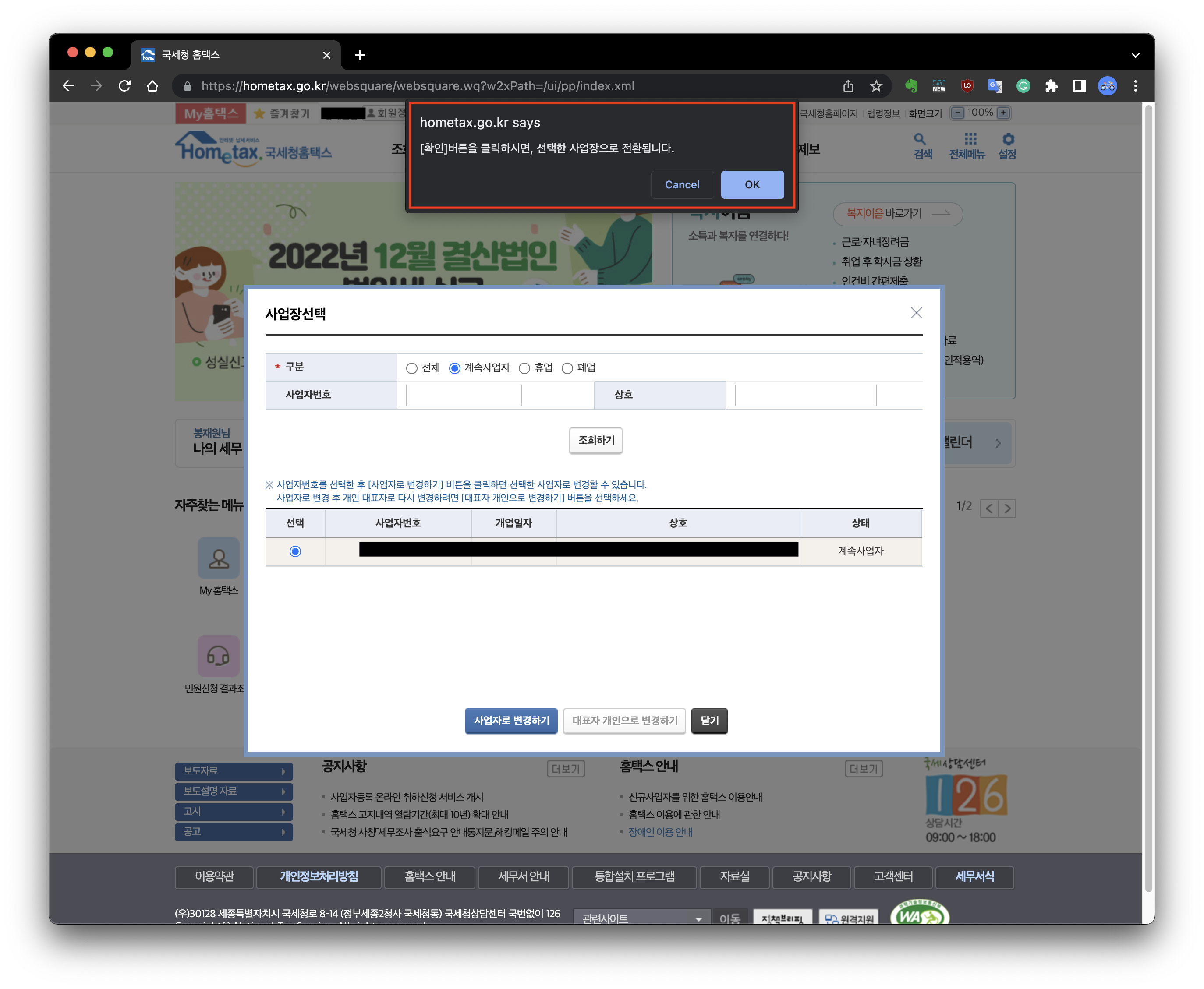 로그인한후, 상단 이름 옆의 [사업장선택]으로 사업자로 변경합니다. 알림창이 뜨고 확인을 누르면 사업장 권한으로 변경됩니다.
