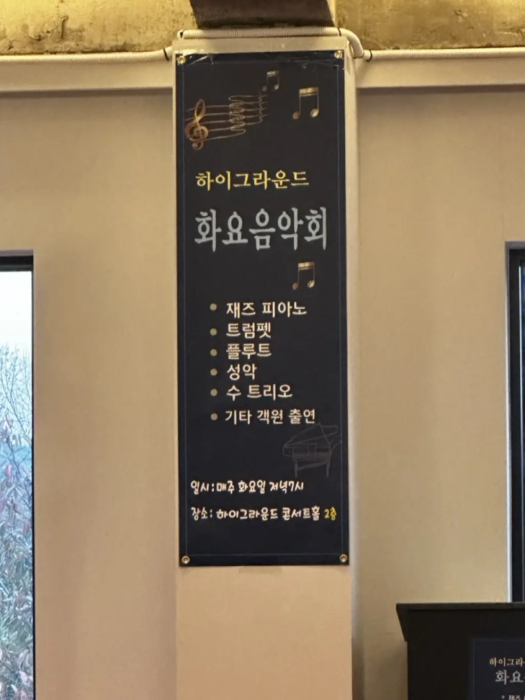 메뉴 주문하는 곳의 2층과 옆동이 연결이 되어 있습니다. 옆동은 뮤지엄 같은 느낌인데요. 화요일에는 음악회를 한다고 하네요.