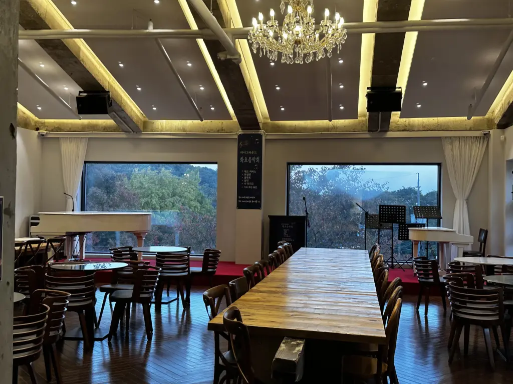 메뉴 주문하는 곳의 2층과 옆동이 연결이 되어 있습니다. 옆동은 뮤지엄 같은 느낌인데요. 화요일에는 음악회를 한다고 하네요.
