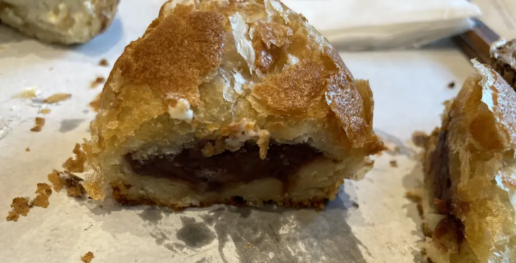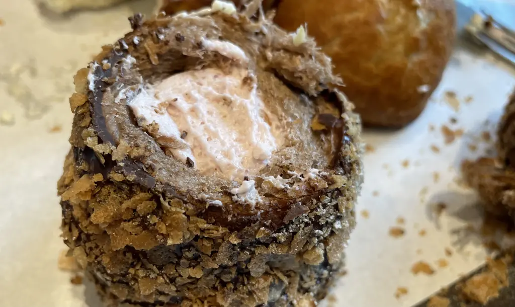 솔방울 빵 내부는 이렇게 크림과 초코 코팅, 프레이크로 구성되어 있습니다.