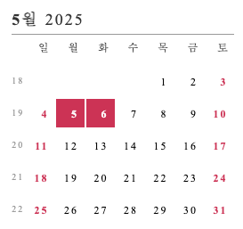 - 5월 5일(월), 6일(화) (어린이날 부처님오신날 겹쳐서 대체 공휴일 포함)